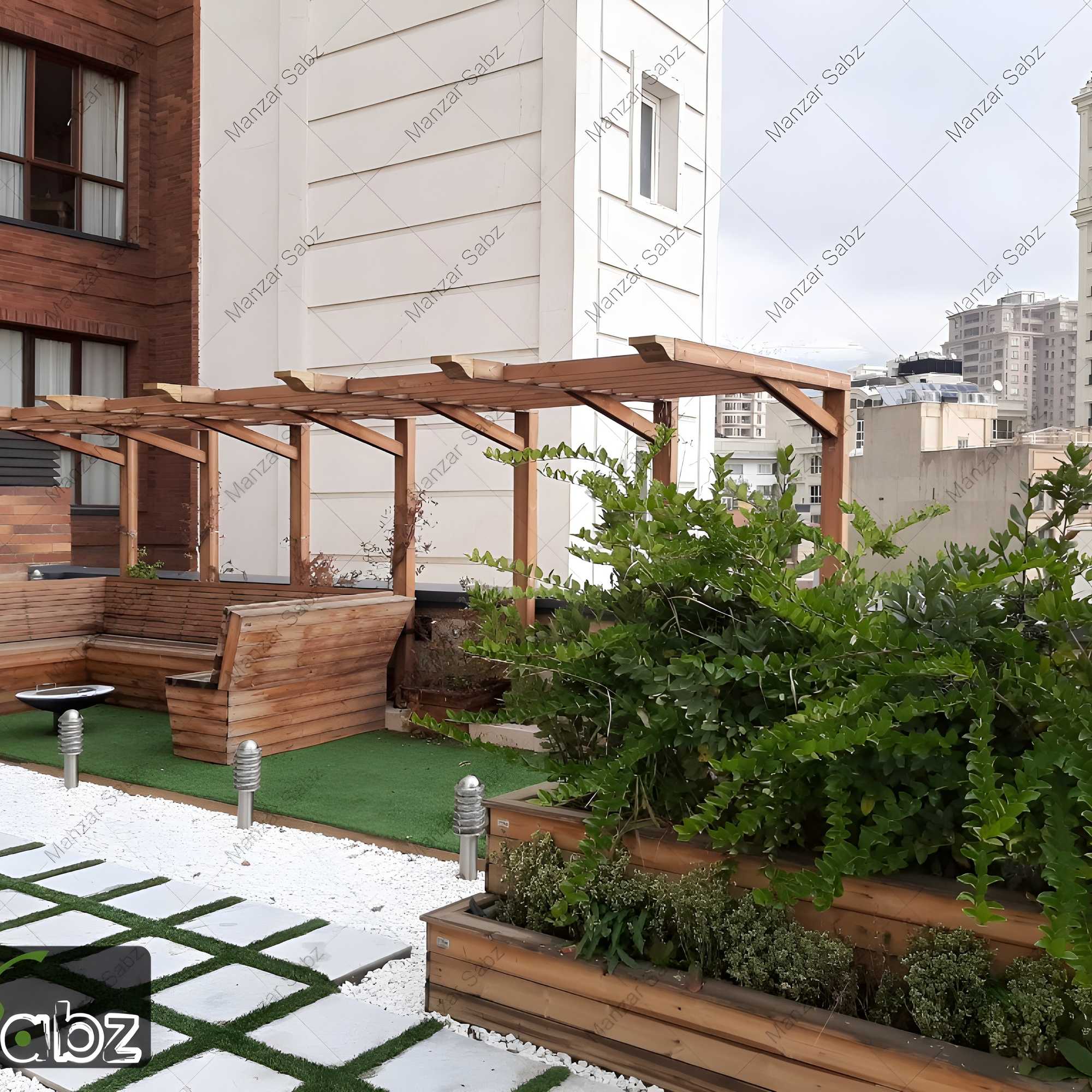 آلاچیق چوبی آبکوه به عنوان بخشی از اجرای روف گاردن آبکوه محسوب می شود. این آلاچیق دقیقا مطابق با طرح معماری با دک چوبی و با چند پله سنگی بالاتر از سطح تمام شده، اجرا شد تا دید بهتری به اطراف داشته باشد. به منظور مقاومت سقف آن در برابر ریزش های جوی و زیبایی بیشتر از سقف شینگل و به منظور چهارفصل کردن آلاچیق بویژه برای فصل زمستان، از گرماتاب در آن استفاده شد.