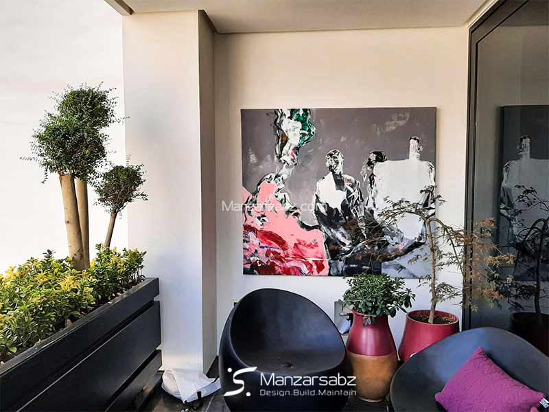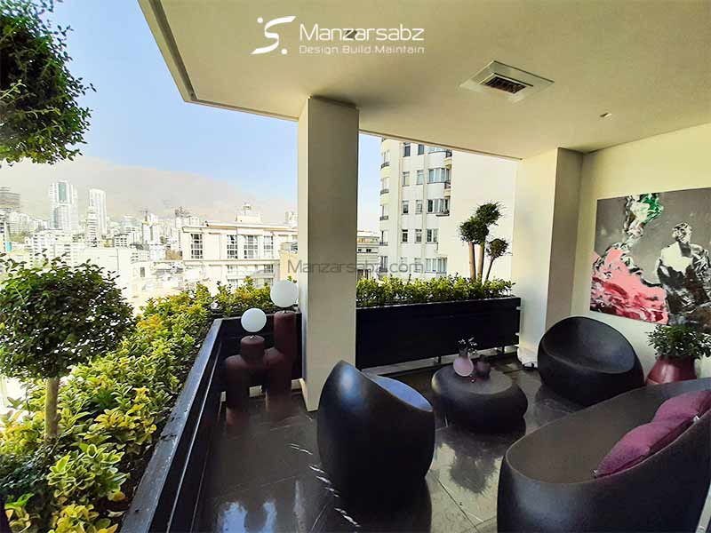 در پوشش گیاهی این بالکن از گونههای متنوعی مانند مورد، شمشاد طلایی، پیتسپروم و افرا سرخ استفاده شده است که ترکیبی دلنشین از رنگ، بافت و فرم گیاهی را ایجاد میکنند و در کنار نور طبیعی فضای بالکن، جلوه بصری خاصی به آن بخشیده است.