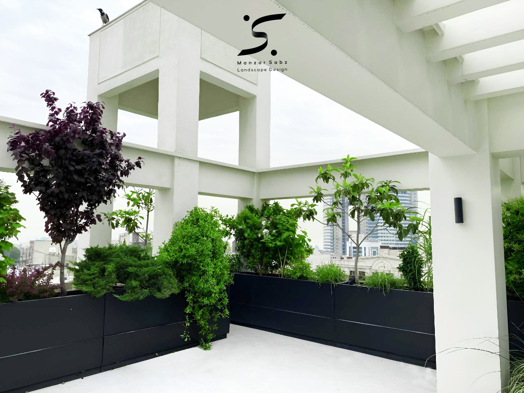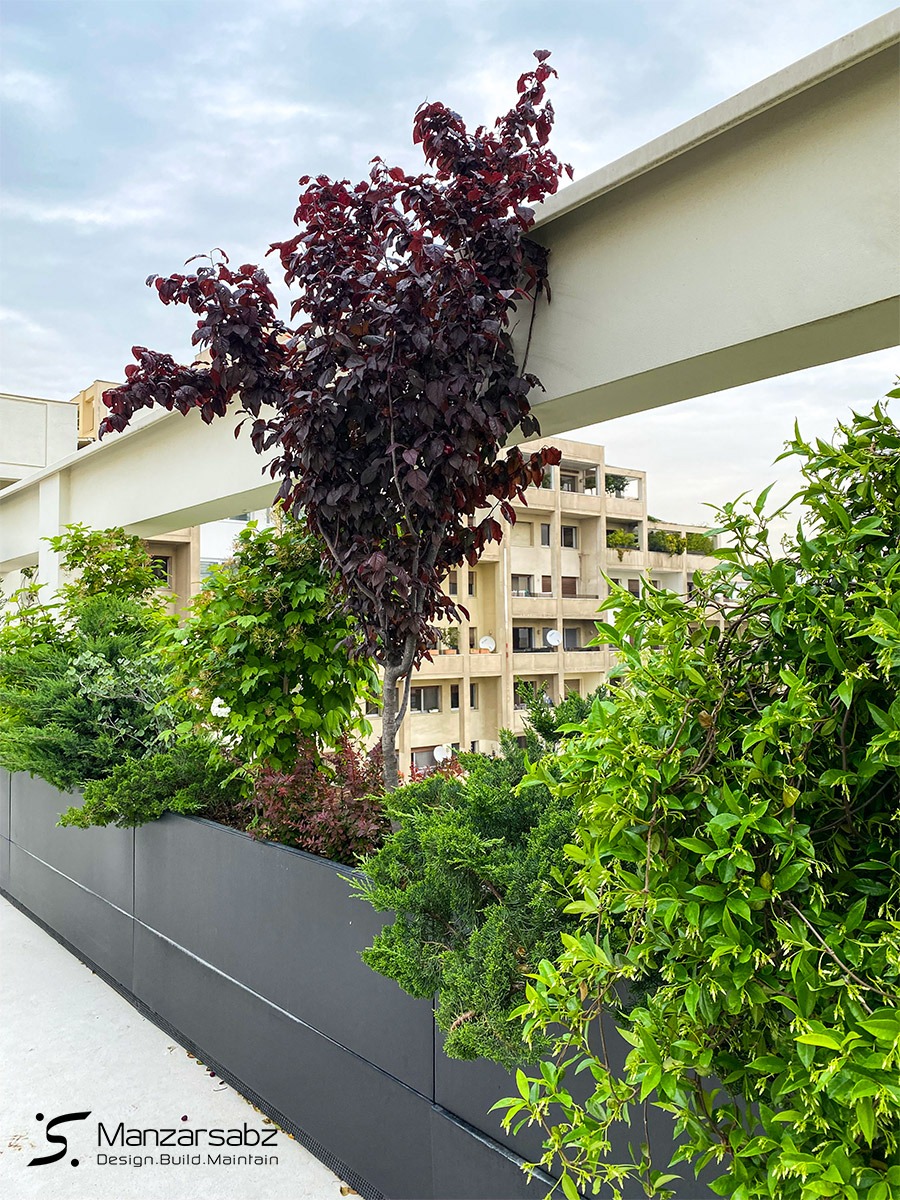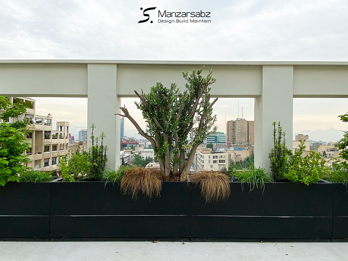 در این پروژه مطابق با طرح ارائه شده ، با استفاده از ورق فلزی فلاورباکس هایی با درب بازشو مطابق با بالکن کوچکتر دو سال پیش، تمامی فلاورباکس ها به منظور اندازه گذاری دقیق در محل پروژه ساخته شده و سپس برای اجرای رنگ کوره ای الکترو استاتیک به کوره رنگ منتقل و مجدد به محل پروژه انتقال داده شد. حساسیت کارفرما در اجرای باکس ها با اندازه های دقیق و رنگ ساده آنها که نمی بایست هیچ گونه موجی در نمای ورق ها نشان دهد، از چالش های اصلی این پروژه بود. در فضای داخلی فلاورباکس ها از چهار لایه ضد ریشه، ژئوتکستایل، ژئودرین و فیلتر خاک استفاده گردید و تمامی آنها دارای خروجی آب بوده که توسط لوله های پلی اتیلن به گاتر زیر باکس ها اتصال پیدا کرده اند. و به منظور دسترسی به سیستم لوله های زهکشی، در نمای فلاورباکس ها درب بازشو (که به آسانی باز و بسته می شود)، طراحی و اجرا گردید. در رابطه با پوشش گیاهی نیز با توجه به درخواست کارفرما مبنی برای استفاده از گونه های بسیار متنوع همیشه سبز و خزان کننده، پوشش گیاهی از درختچه ها و بوته های متنوع همچون یک باغ انتخاب و اجرا شد تا منظره ای تابستانی و زمستانی پدید آورد. برای آبیاری هم از سیستم آبیاری اتوماتیک با شیرهای برقی استفاده شد.