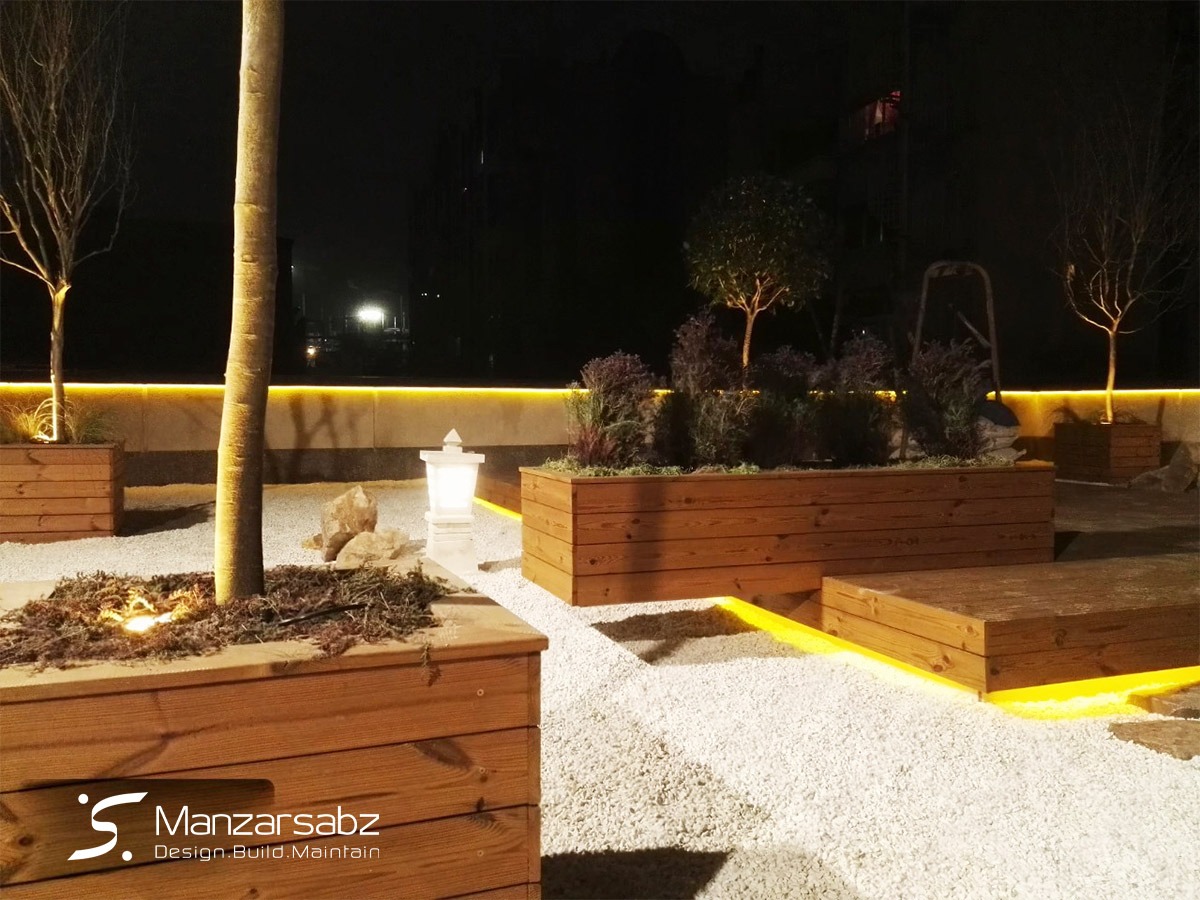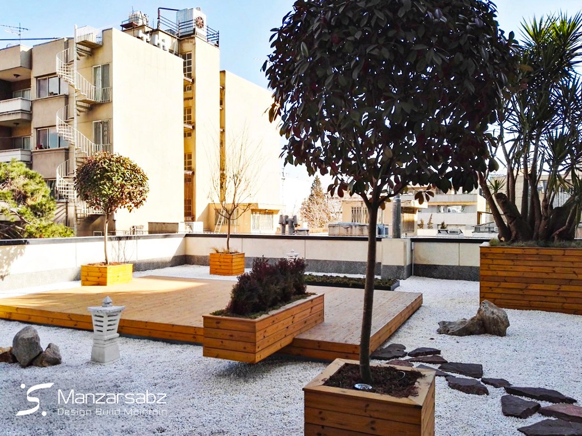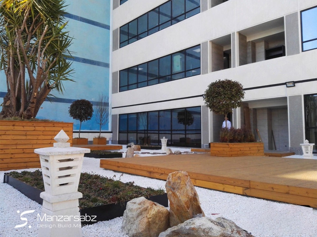 طراحی باغ زاپنی این پروژه به منظور ایجاد یک چشم انداز زیبا به تراس دفتر مدیریت یک واحد اداری و با ایده باغ های ژاپنی توسط تیم منظر سبز انجام و پس از تایید کارفرما مطابق با طرح اجرا گردید. ایجاد یک تراس گاردن با سیستم نیمه متمرکز و با بهره گیری از اصول باغ های ژاپنی و بهره مندی از پوشش گیاهی زیاد، برای ایجاد یک چشم انداز زیبا از اهدافی بود که در این پروژه رعایت گردید. حاکمیت هارمونی و تعادل در منظرسازی از مشخصه های باغ ژاپنی است که در طراحی و اجرای این پروژه رعایت گردید به گونه ای که تمامی عناصر جایگاه و کیفیت یکسانی در طرح دارند و هیچ عنصری ظهوری برجسته تر از سایر عناصر ندارد.