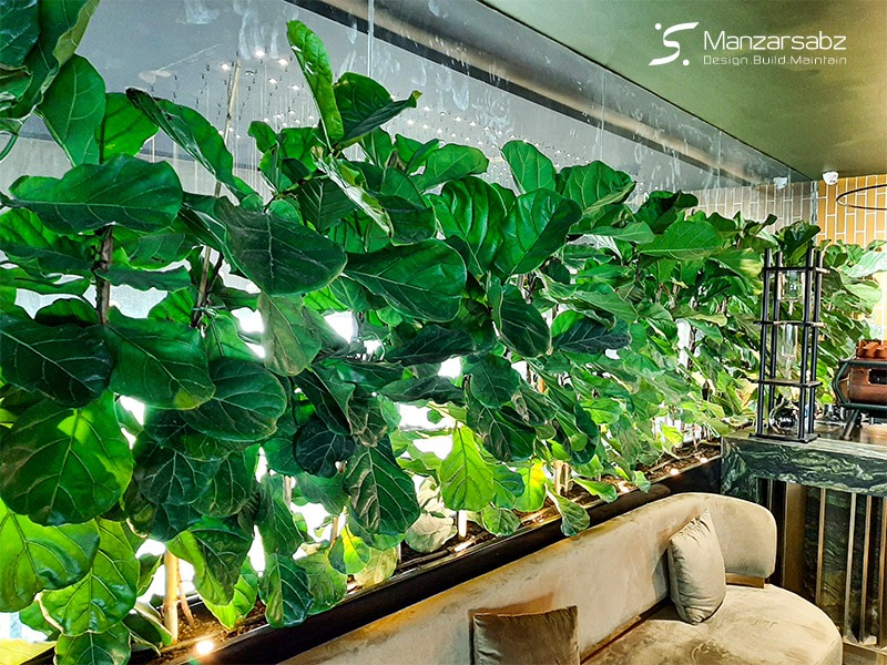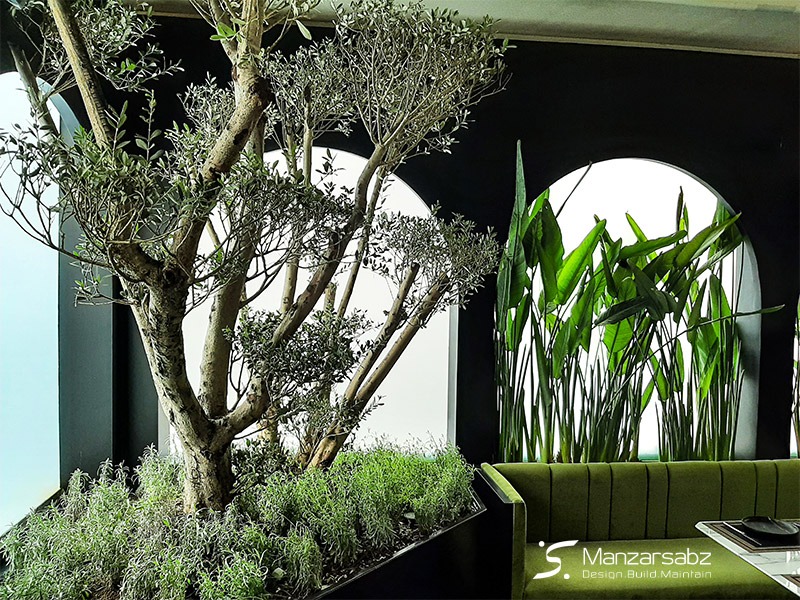 در این پروژه مطابق با طرح دور تا دور طبقه دوم رستوران با استفاده از ورق فلزی فلاورباکس هایی با درب بازشو طراحی و اجرا گردید. تمامی سطح بیرونی و داخلی باکس ها از رنگ اپوکسی برای جلوگیزی از زنگ زدگی استفاده و در جداره داخلی از چهار لایه ضد ریشه، ژئوتکستایل، ژئودرین و فیلتر خاک استفاده گردید. تمامی فلاورباکس ها دارای خروجی آب بوده که توسط لوله های پلی اتیلن به کف شور های اصلی سالن اتصال پیدا کرده اند. و به منظور دسترسی به سیستم لوله های زهکشی، در نمای فلاورباکس ها درب بازشو طراحی و اجرا گردید. در رابطه با پوشش گیاهی نیز در دو طرف گوشه های سالن از ۴ درختچه زیتون به همراه لاوان و دورتا دور به منظور یکدستی و هماهنگی از گونه گیاهی پرنده بهشتی استفاده شد. همچنین در نیم طبقه هم گونه فیکوس لیراتای انتخاب و اجرا گردید.