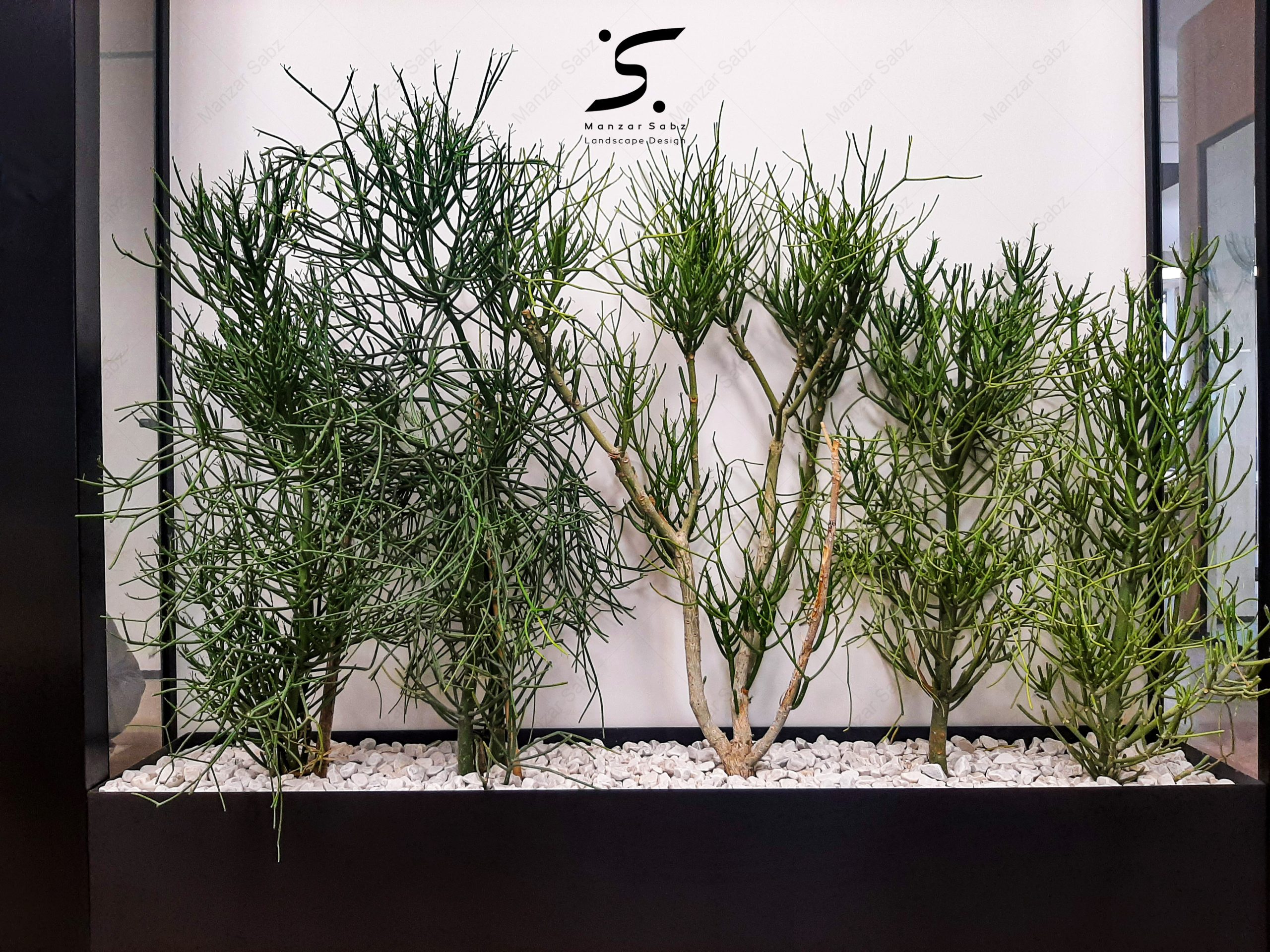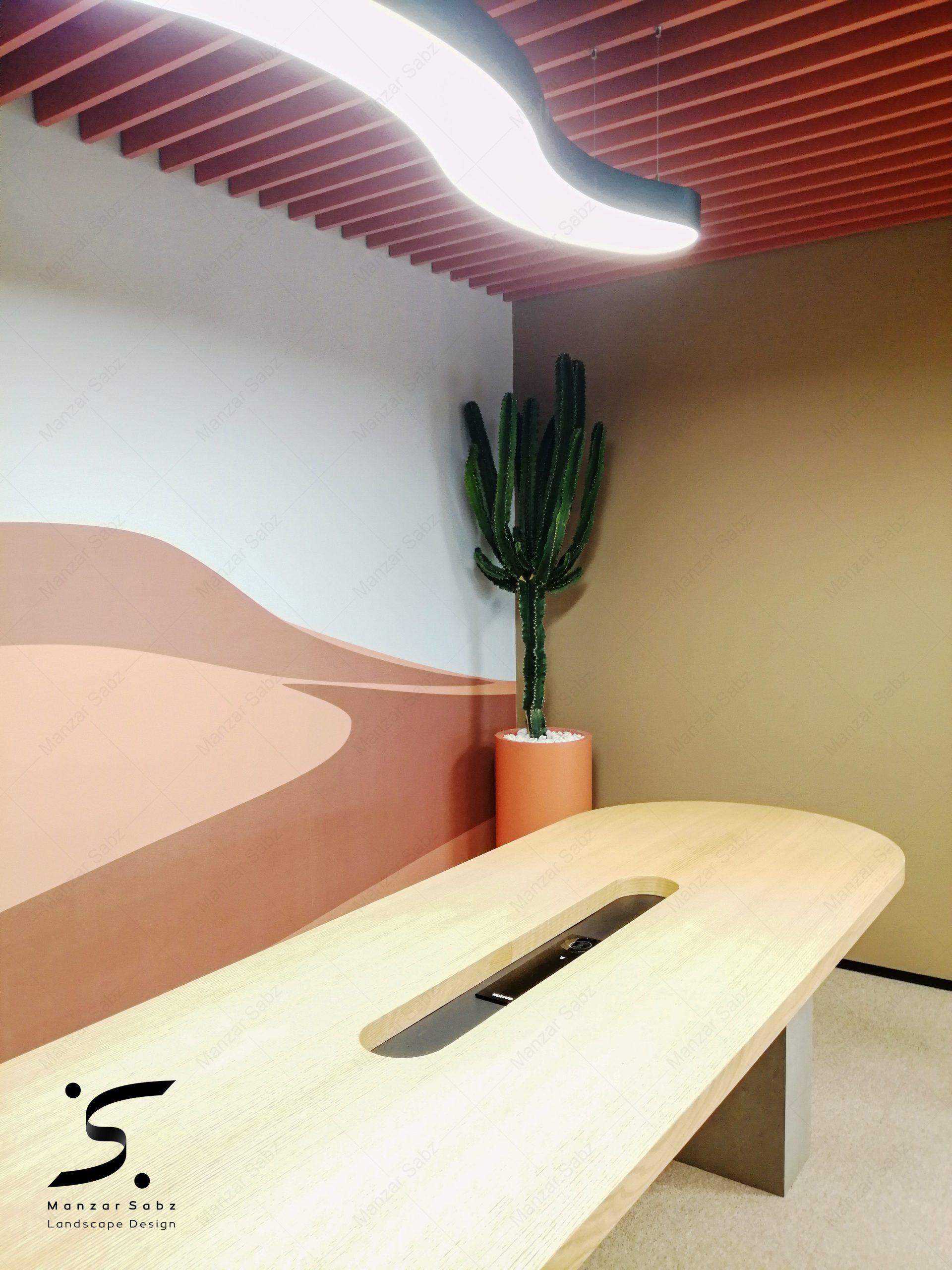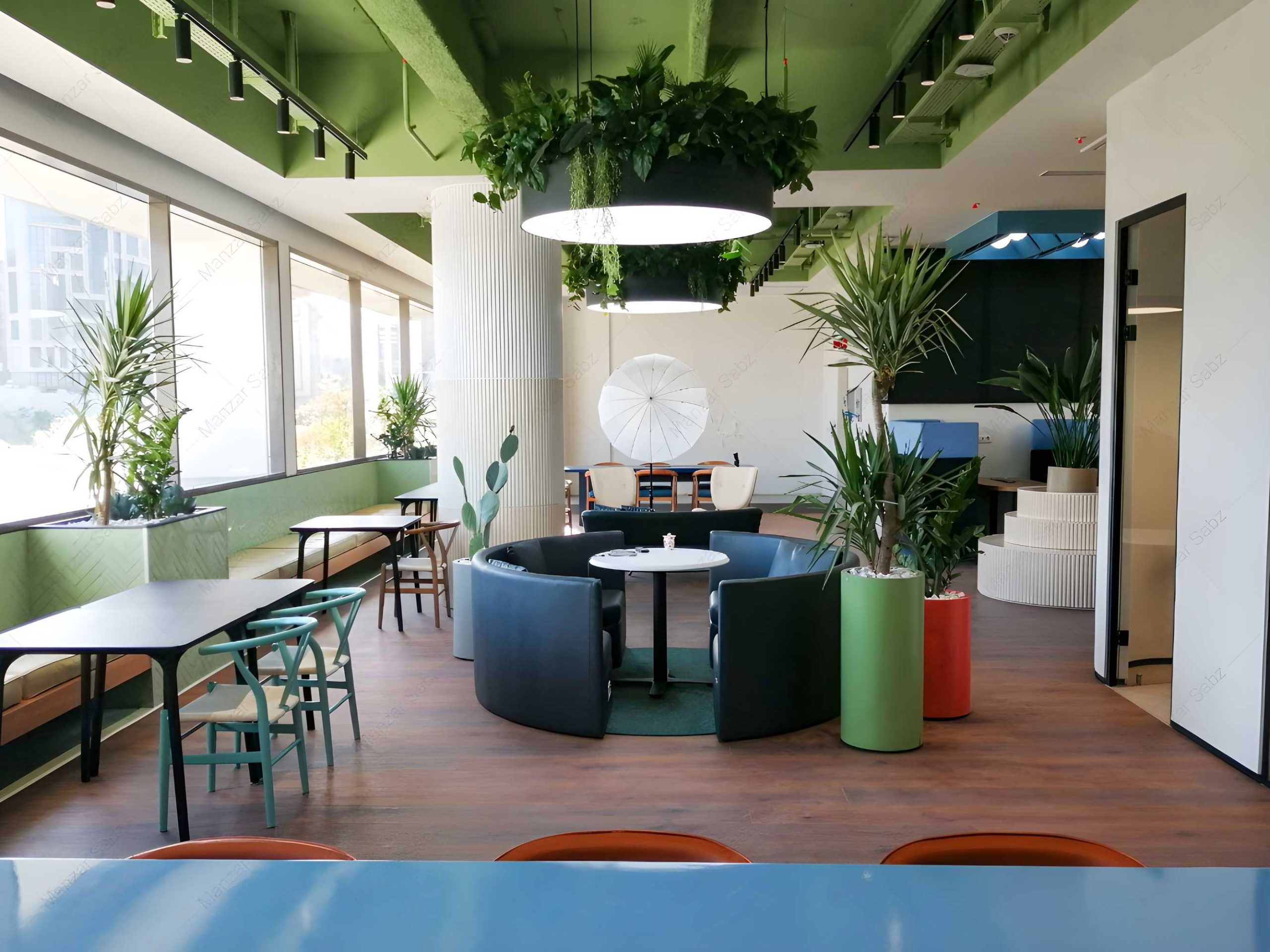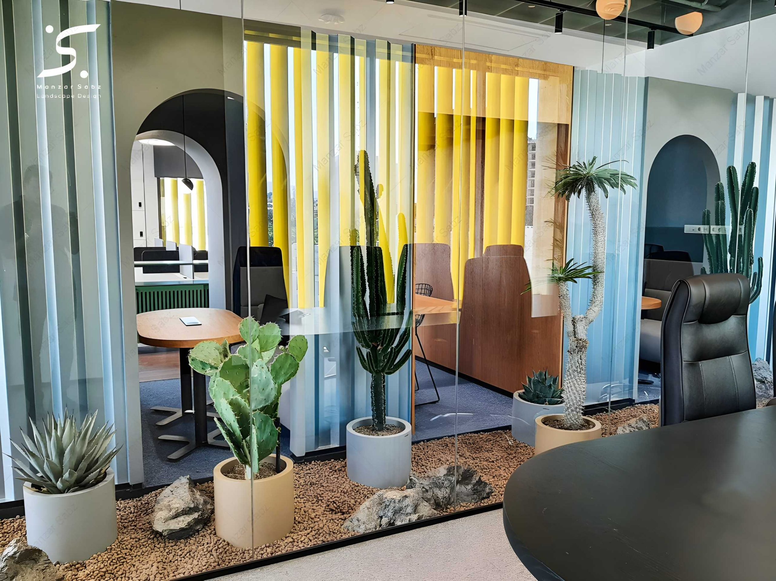 نقش عناصر طبیعی مخصوصا گیاهان؛ در جذابیت فضا و طراحی داخلی بر کسی پوشیده نیست. در طراحی این پروژه نیز، دفتر معماری باغ ایرانی همچون سایر پروژه های داخلی این دفتر، رویکردی طبیعت گرا به یک محیط کار داشت. ما نیز سعی کردیم با انتخاب گیاهان مناسب از خانواده کاکتوس ها و ساکولنت ها برای هر قسمت از فضای محیط کاری و جانمایی درست آنها براساس ویژگی های محیطی، به هر چه بهتر اجرا شدن ایده طراح کمک نماییم. طراحی سبزینگی با استفاده از کاکتوس ها و ساکولنت هابه عنوان یک المان گیاهی؛ علاوه بر زیبایی ذاتی؛ حس طبیعت رو در فضا ایجاد و تمام سال جذابیت خود را حفظ می کند. طراحی و اجرای یک باغ کاکتوس به عنوان نماد و تقلیدی از طبیعت، یکی از جذابترین قسمت های این پروژه است که هم از لحاظ زیبایی شناسی و هم عملکردی تلاش معمار در جهت ارائه تفسیری از اصول طبیعت برای ساخت فرم های طبیعی است.