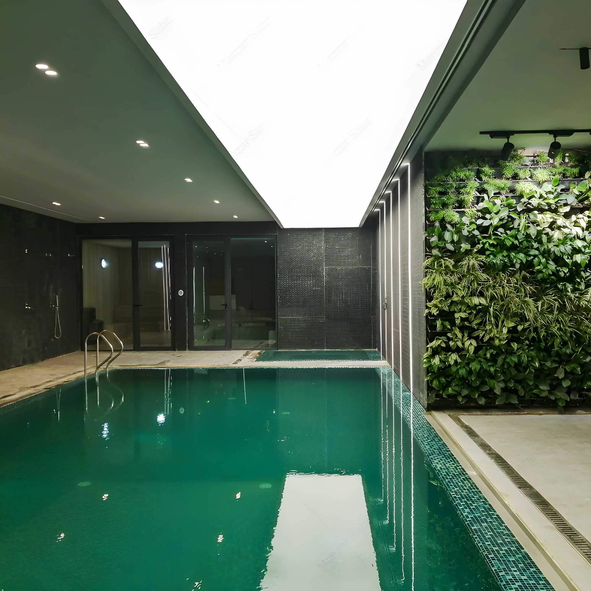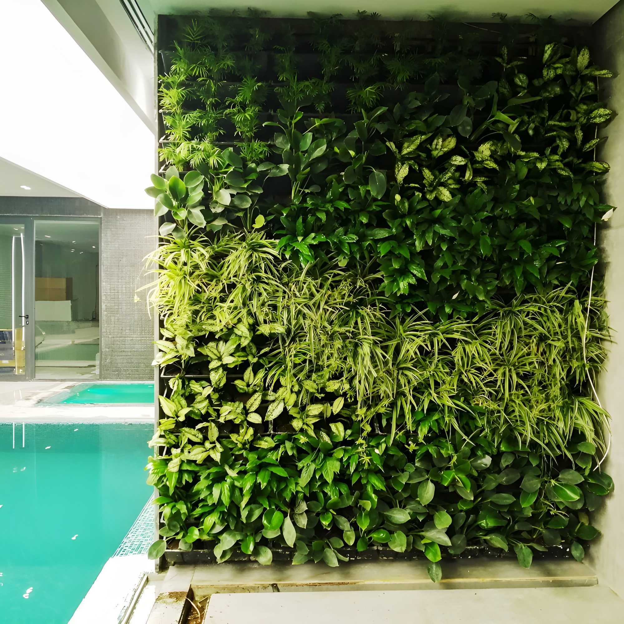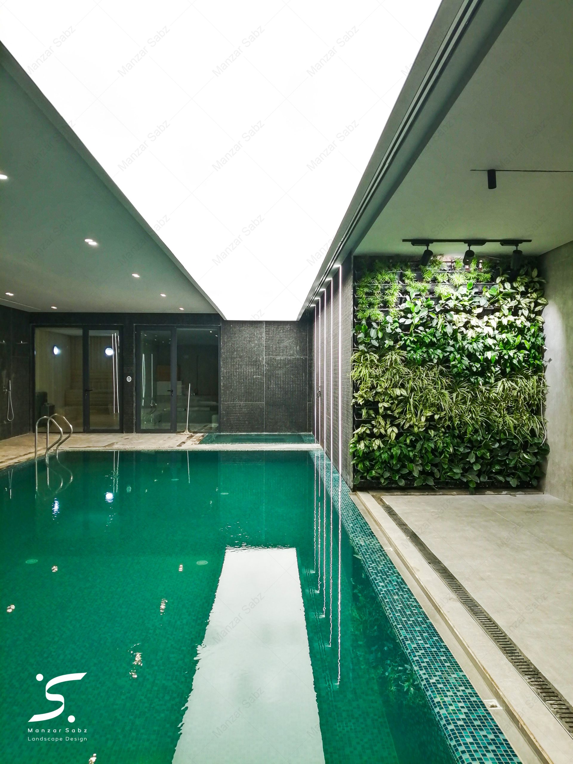 دیوار سبز استخر یاسر در طبقه منفی ۶ استخر یک ساختمان مسکونی مطابق با طرح معماری احداث گردید. قبل از احداث آن از کارفرما در خواست شد که در زیر دیوار سبز گاتر و کف شور و به منظور سیستم آبیاری و نورپردازی انتظارهای آب و برق پیش بینی شود. مهمترین چالش اجرایی این دیوار سبز در انتخاب گونه های گیاهی آن بود، چون با توجه به رطوبت بسیار بالا و نبود نور طبیعی باید از گیاهان مقاوم به این شرایط استفاده می شد. در نهایت با استفاده از نورهای مصنوعی سعی کردیم که کمبود نور گیاهان را جبران نماییم.