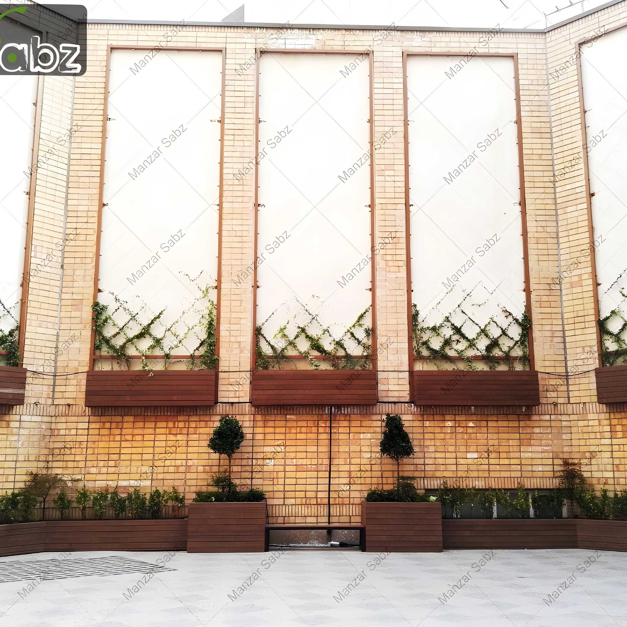 ۹ عدد قاب در محوطه مدرسه به ابعاد حدود ۲ در ۱۱ متر برای اجرای دیوار سبز به ما تحویل داده شد. به علت ارتفاع بلندی که در قاب ها وجود داشت نصمیم گرفتیم که از دیوار سبز کابلی استفاده کنیم و گیاهان رونده ای که روی این قاب های کابلی بالا می روند. به این منظور در قسمت پایین هر قاب هم یک فلاورباکس با نمای چوب پلاست ساخته شد که گیاهان رونده در آن کاشته شوند. چالش اصلی در اجرای این پروژه، کار در ارتفاع و نگه داشتن سازه دیوار سبز و فلاورباکس ها با توجه به ارتفاع بلند دیوارها بود.