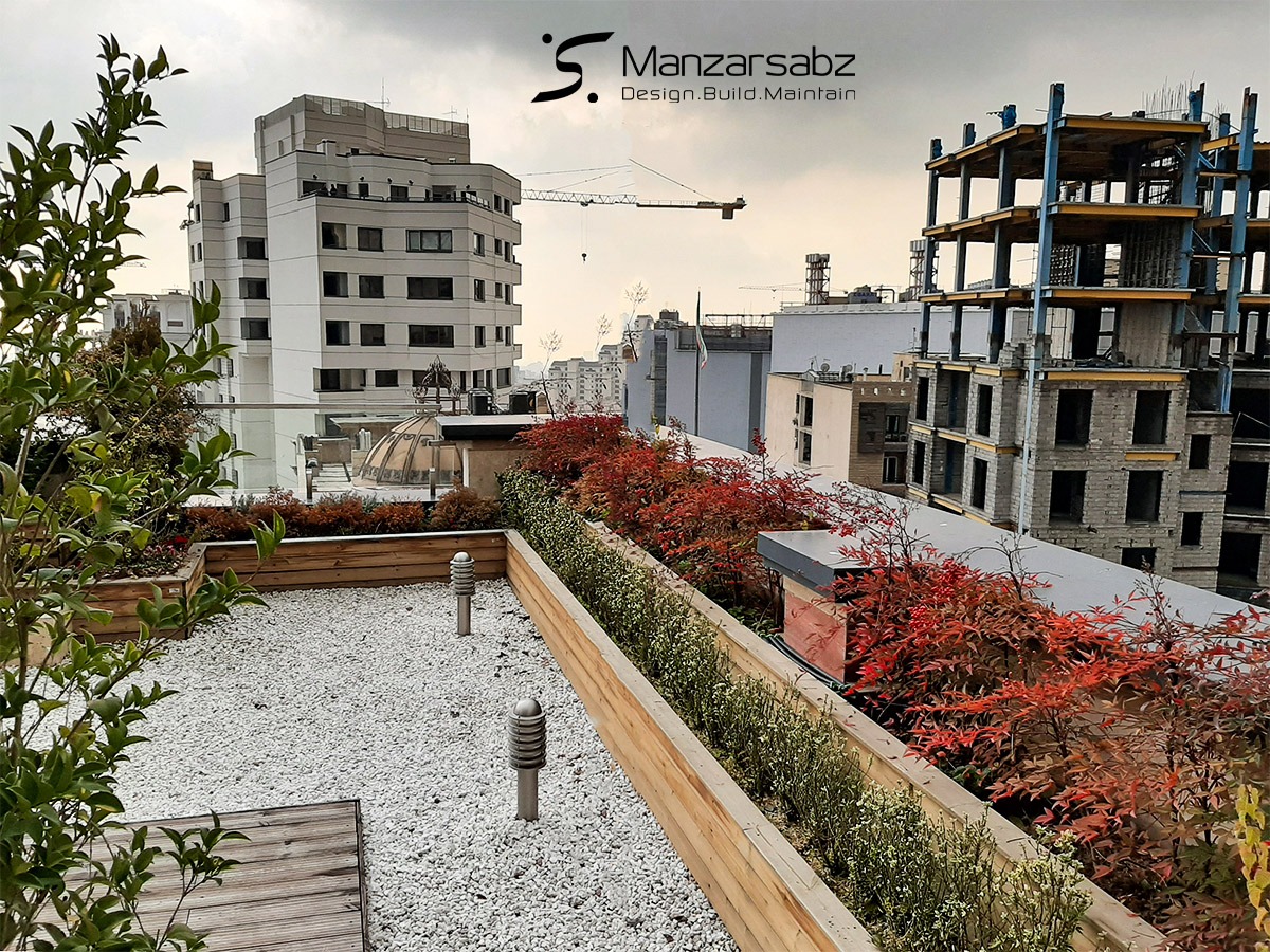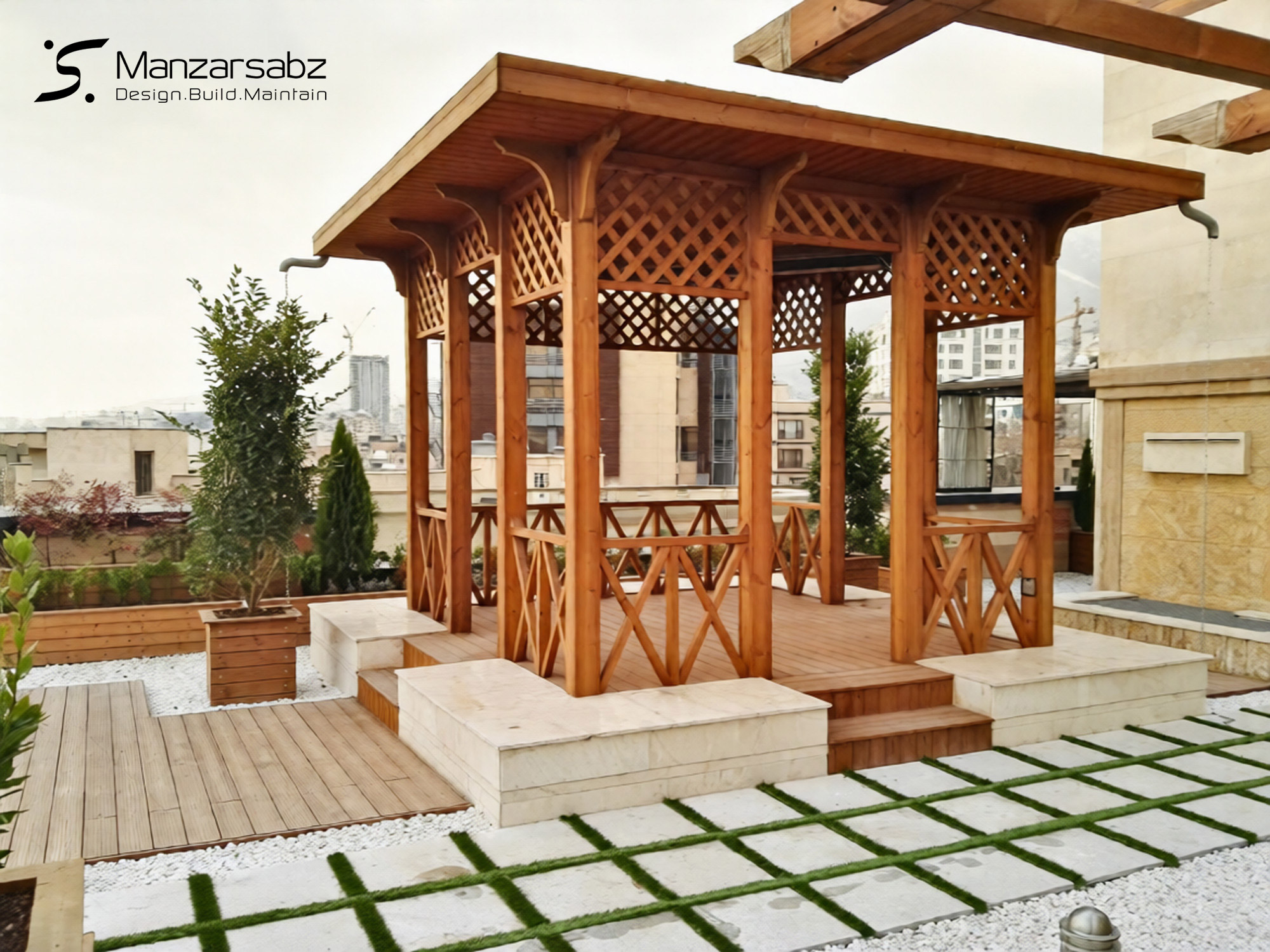 اجرای روف گاردن آبکوه که شامل سازه های چوبی، المان های فلزی، کفسازی و لایه بندی کامل فضای سبز را به عهده داشتیم.