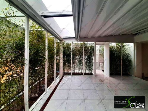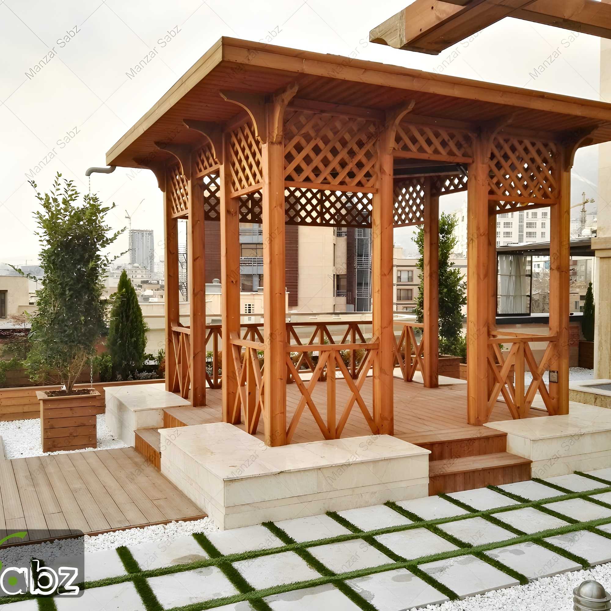 استفاده از آلاچیق چوبی با سقف شینگل و گرماتاب برای استفاده در تمامی فصول، آشپزخانه مسقف و فایرپلیس مینیمال در زیر پرگولا از ویژگی های شاخص این روف گاردن است.