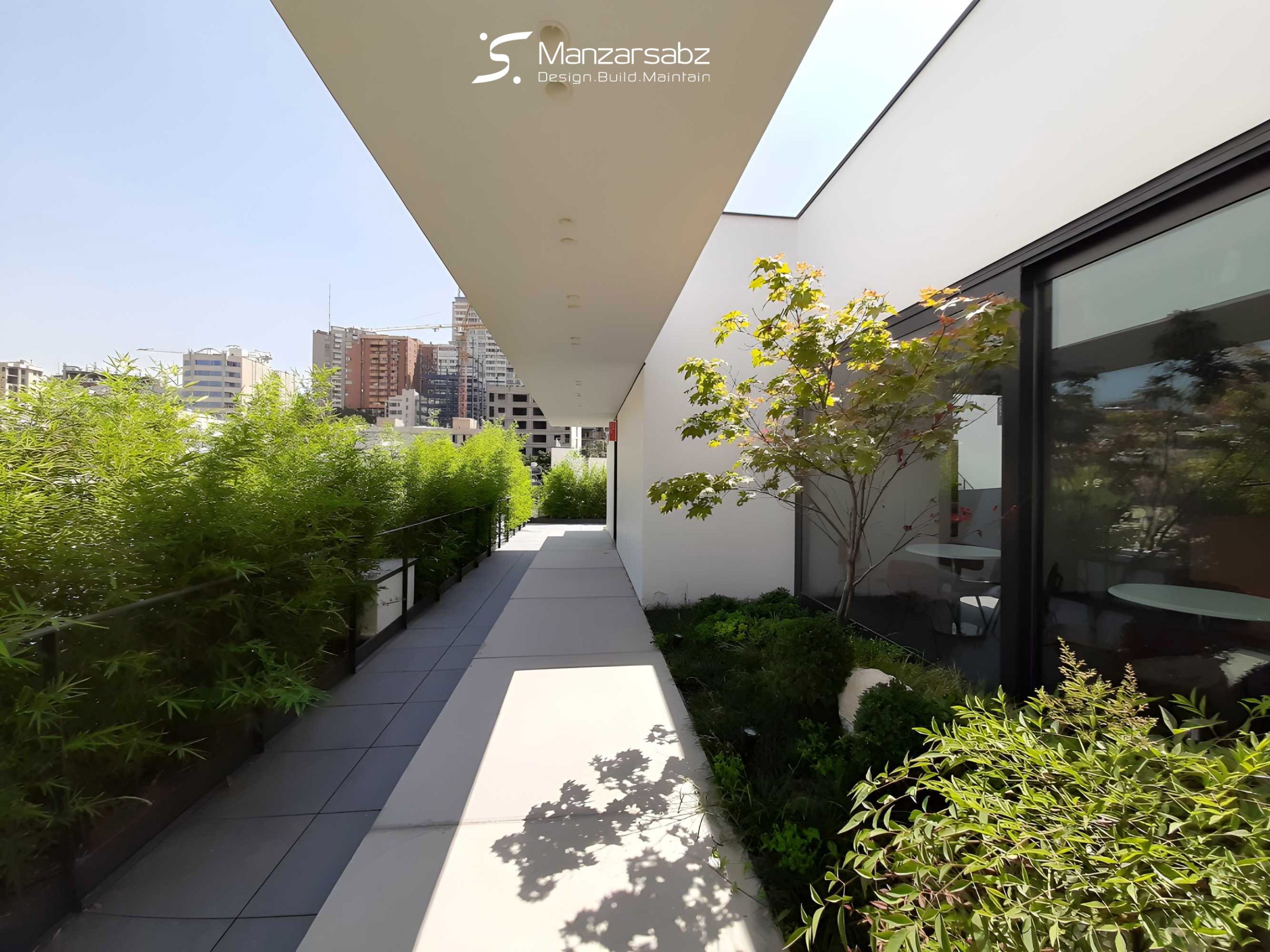 این روف گاردن اداری در پشت بام یک ساختمان اداری جهت استفاده کارکنان از سالن غذاخوری و اتاق ورزش توسط تیم شرکت باغ ایرانی احداث شده است. به منظور اجرای فضای سبز نیمه گسترده این پروژه، با توجه به کف کاذب اجرا شده، ابتدا تمامی قسمت های سبز با فلاورباکس های فلزی و رنگ اپوکسی اجرا و سپس لایه بندی های روف گاردن ، خاکریزی و کاشت پوشش گیاهی انجام شد. در طراحی کاشت این پروژه سعی شد که با توجه به کاربری هر فضا و با استفاده از گونه های گیاهی متنوع، فضای بسیار زیبایی به عنوان چشم انداز برای استفاده کنندگان خلق شود.