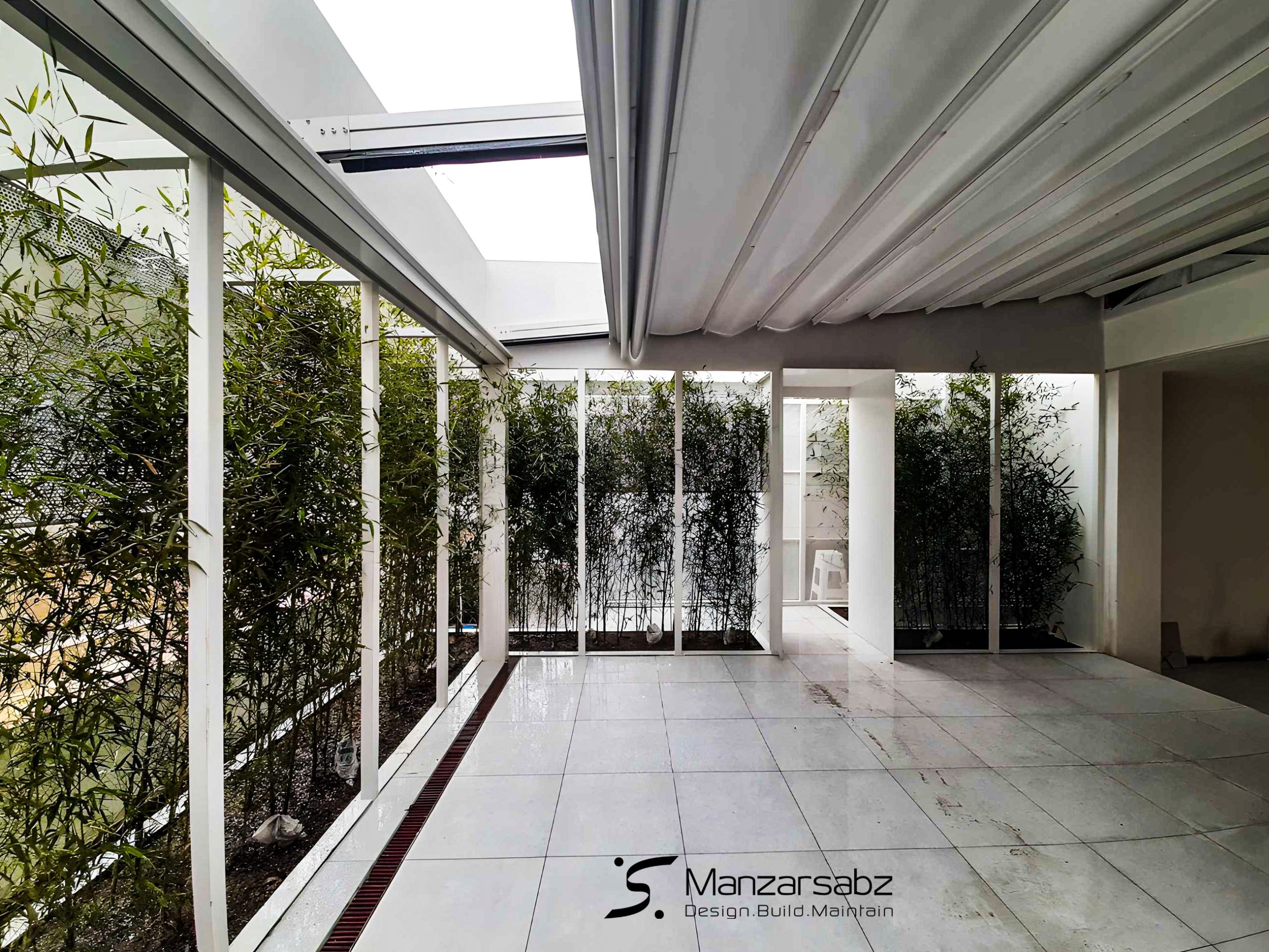 در این پروژه مطابق با طراحی انجام شده، دور تا دور فضای کافه فلاورباکس هایی با استفاده از ورق های فلزی و چهار لایه ضد ریشه، ژئوتکستایل، ژئودرین و فیلتر خاک اجرا شد؛ مطابق با نظر کارفرما به دلیل قرار گرفتن فضای کافه در حیاط و قرار داشتن رمپ پارکینگ در کنار کافه، گونه گیاهی نی خیزران (بامبو) انتخاب و کاشته شد که علاوه بر تلطیف هوا و فضای کافه حریم خصوصی استفاده کنندگان را نیز تامین کند. در نهایت آبیاری گیاهان به صورت قطره ای با تایمر اتوماتیک اجرا شد. یکی از اساسی ترین نکات نگهداری گیاهان چه در منزل و چه در فضای باز، آبیاری منظم هم از نظر حجم آب و هم فاصله بین آبیاری هاست. که راه حل این دو مساله استفاده از آبیاری اتوماتیک است.