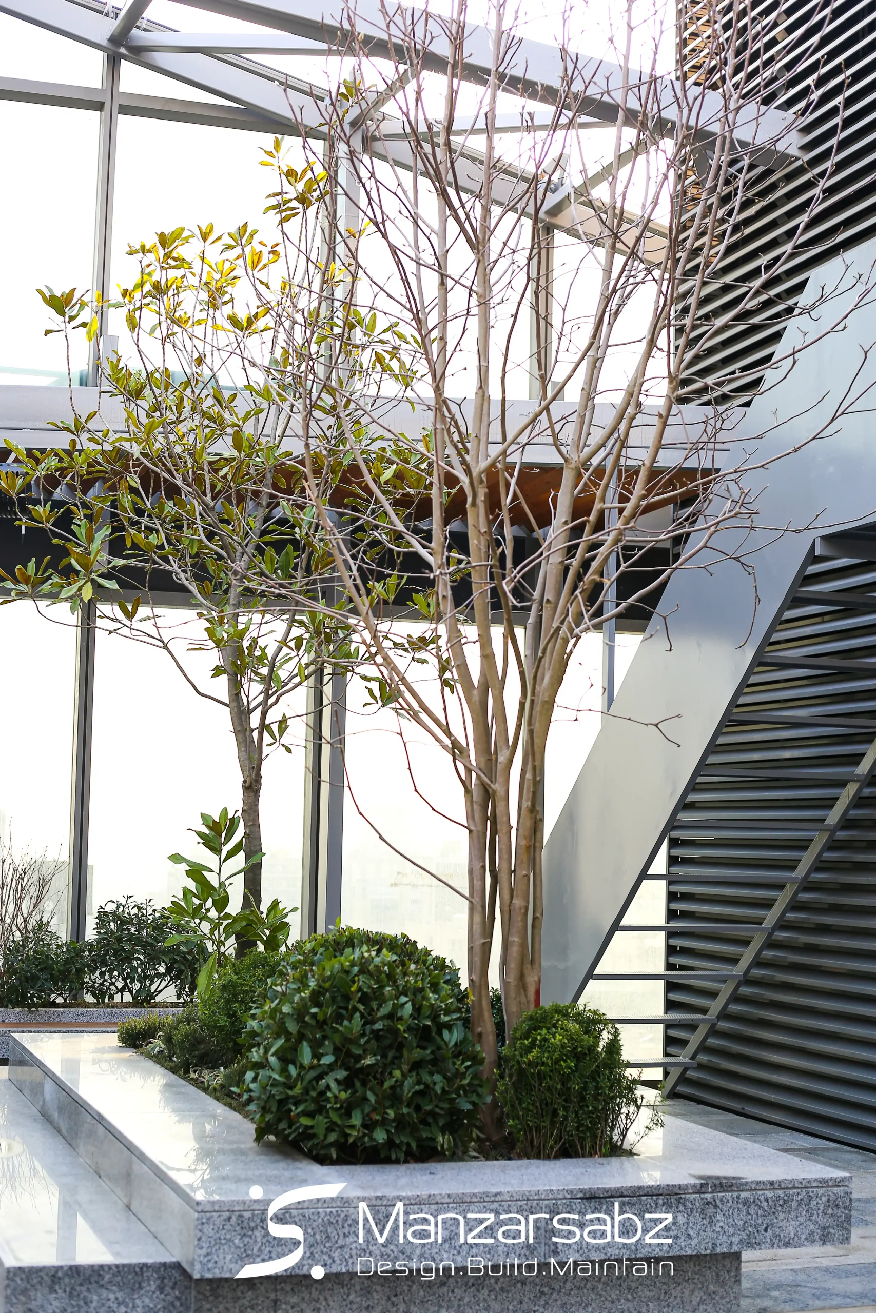 طراحی و اجرای فلاورباکسها بهعنوان عناصر اصلی سازماندهنده فضا، نقش مهمی در تفکیک عملکردی و ایجاد ریتم بصری داشته و بستر مناسبی برای کاشت گونههای متنوع گیاهی فراهم کرده است.