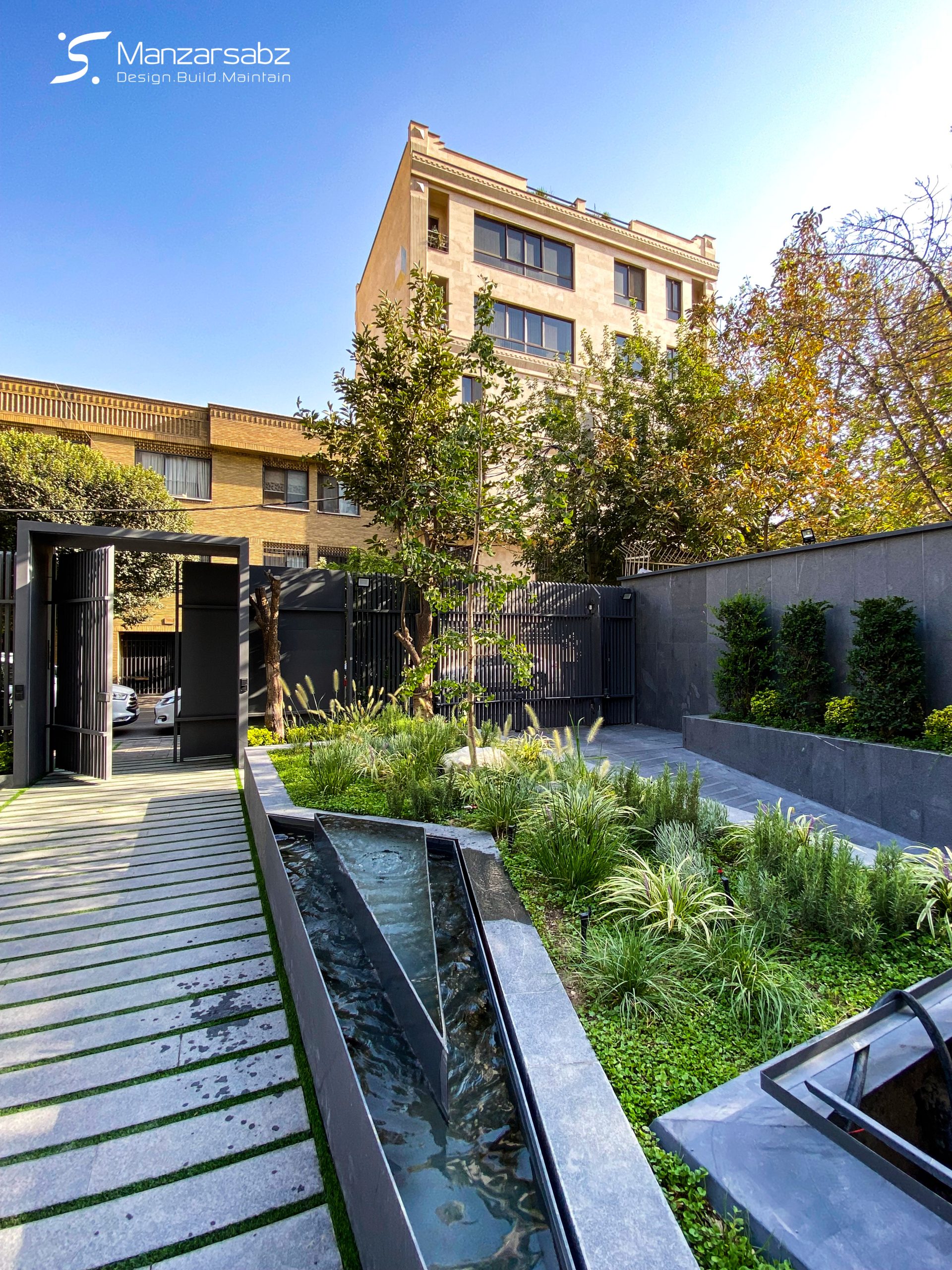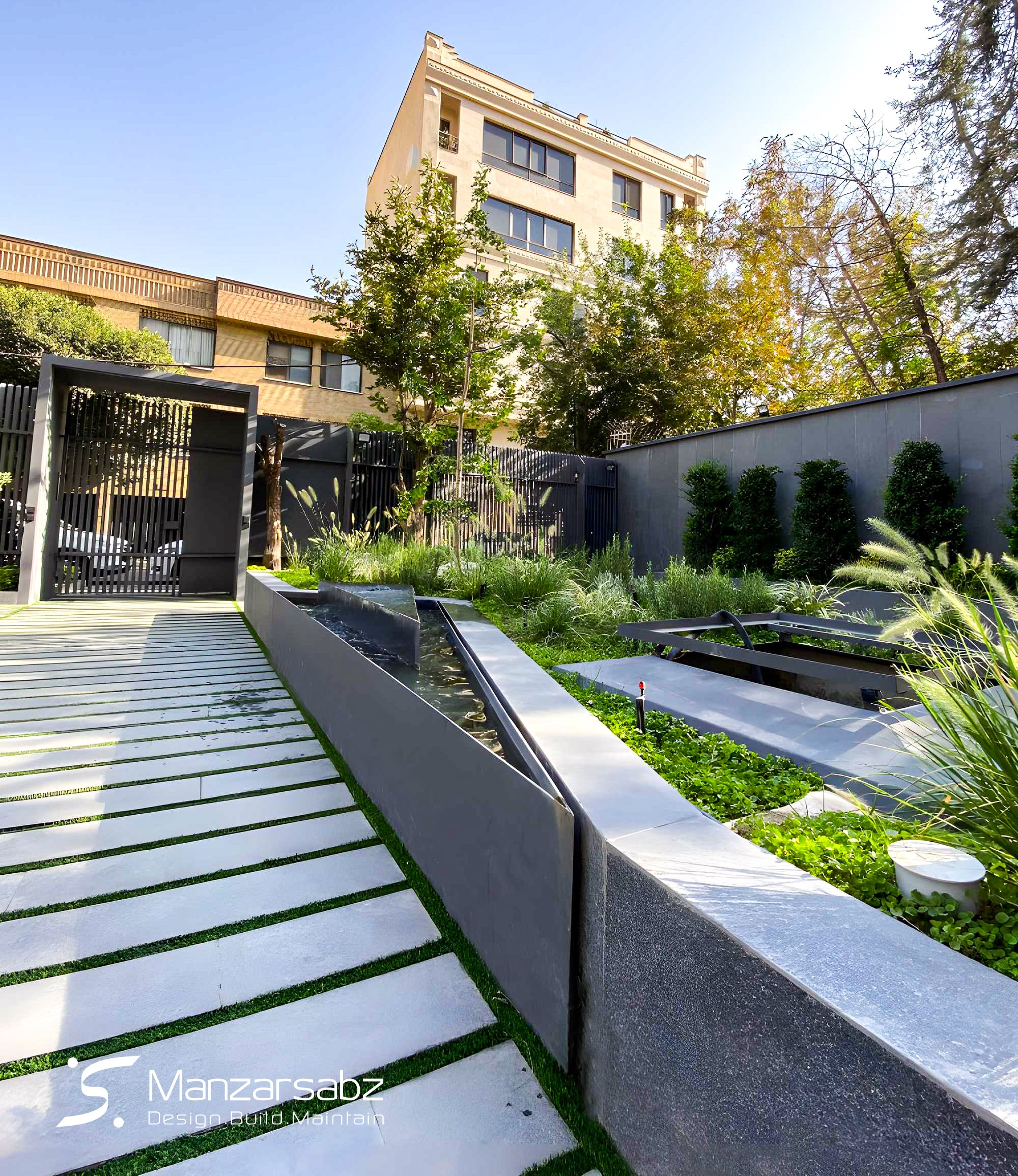 در این پروژه، آبنما بهعنوان محور اصلی ورودی طراحی شده تا حس دعوتکنندگی و آرامش را همزمان منتقل کند. فرم خطی و هندسی آن، با ورق فلزی و لبههای دقیق، شخصیت مدرن فضا را تقویت میکند.